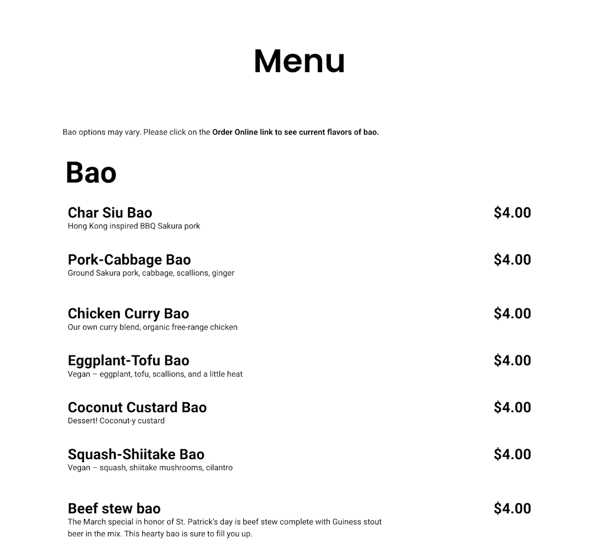 Xiao Bao Bao — Downtown Menu