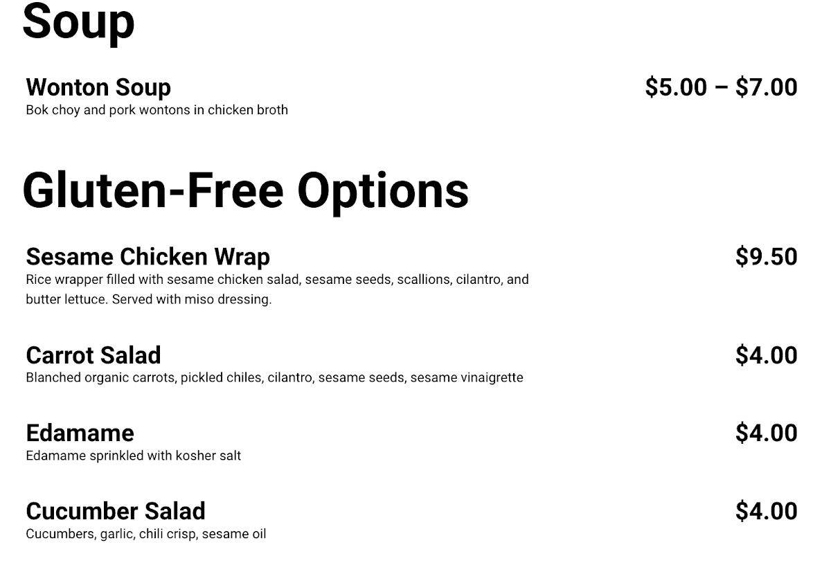 Highlights such as the Nikuman, Egg Tart, and the fusion-style Eggplant-Tofu Bao showcase a blend of comforting textures and mild, approachable spices. This makes the menu well suited for those seeking familiar warmth with a hint of creative flair. Additionally, lighter choices like the carrot salad and cucumber salad provide fresh, gluten-free alternatives that complement the softer bao selections.